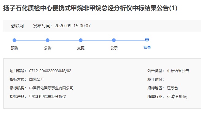 2020年9月15日揚子石化質(zhì)檢中心便攜式甲烷非甲烷總烴分析儀中標(biāo)結(jié)果公示,招標(biāo)人:中國石化國際事業(yè)有限公司,項目編號為:0712-204022003048/02。本次江蘇省招標(biāo)產(chǎn)品為: 甲烷非甲烷總烴分析儀,招標(biāo)范圍:便攜式甲烷非甲烷總烴分析儀1臺,中標(biāo)人青島環(huán)控設(shè)備有限公司。