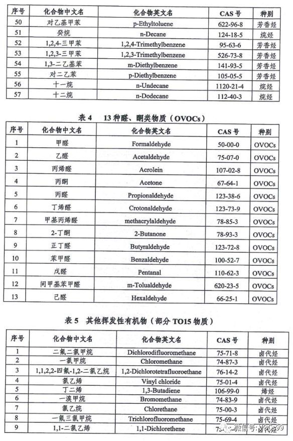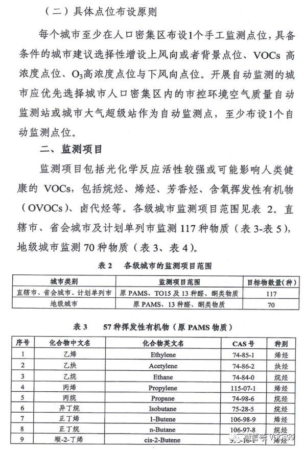 監(jiān)測項目包括光化學反應(yīng)活性較強或可能影響人類健康的VOCs,包括烷烴、烯烴、芳香烴、含氧揮發(fā)性有機物(OVOCS)、鹵代烴等。各級城市監(jiān)測項目范圍見表2。直轄市、省會城市及計劃單列市監(jiān)測117種物質(zhì)(表3-表5),地級城市監(jiān)測70種物質(zhì)(表3、表4)。